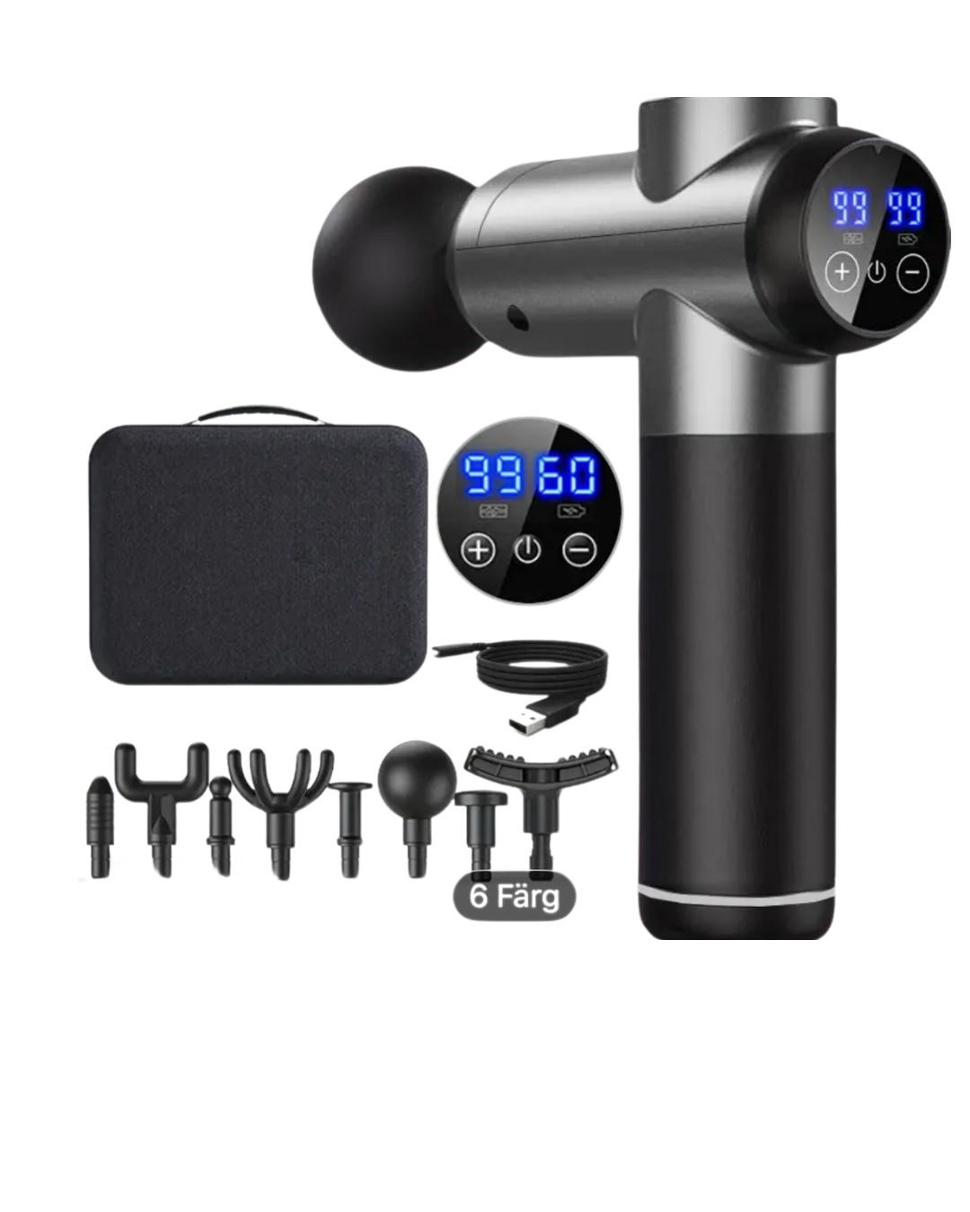 En elektrisk massagepistol med djupvävande pulserande massage, utrustad med LCD- skärm och USB-laddning. Den levereras med 8 olika massagehuvuden för att passa olika muskelgrupper - perfekt som en omtänksam present till familjen eller vid högtider.